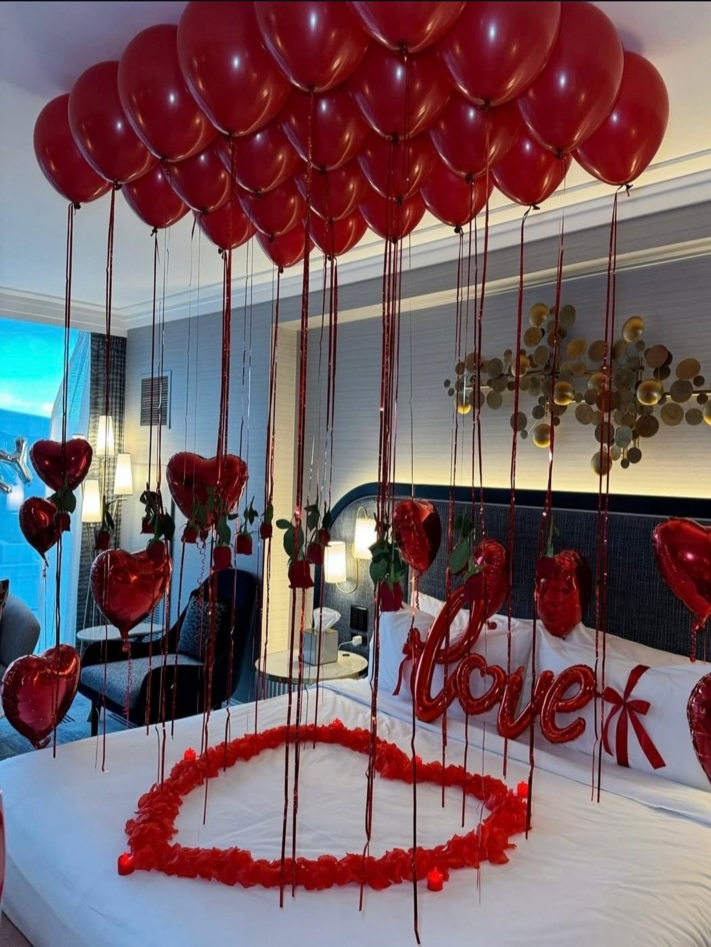 A classic romantic room setup designed to create an intimate Valentine’s surprise. Featuring soft balloon accents, glowing candlelight, and thousands of rose petals, this package sets the perfect mood for love.