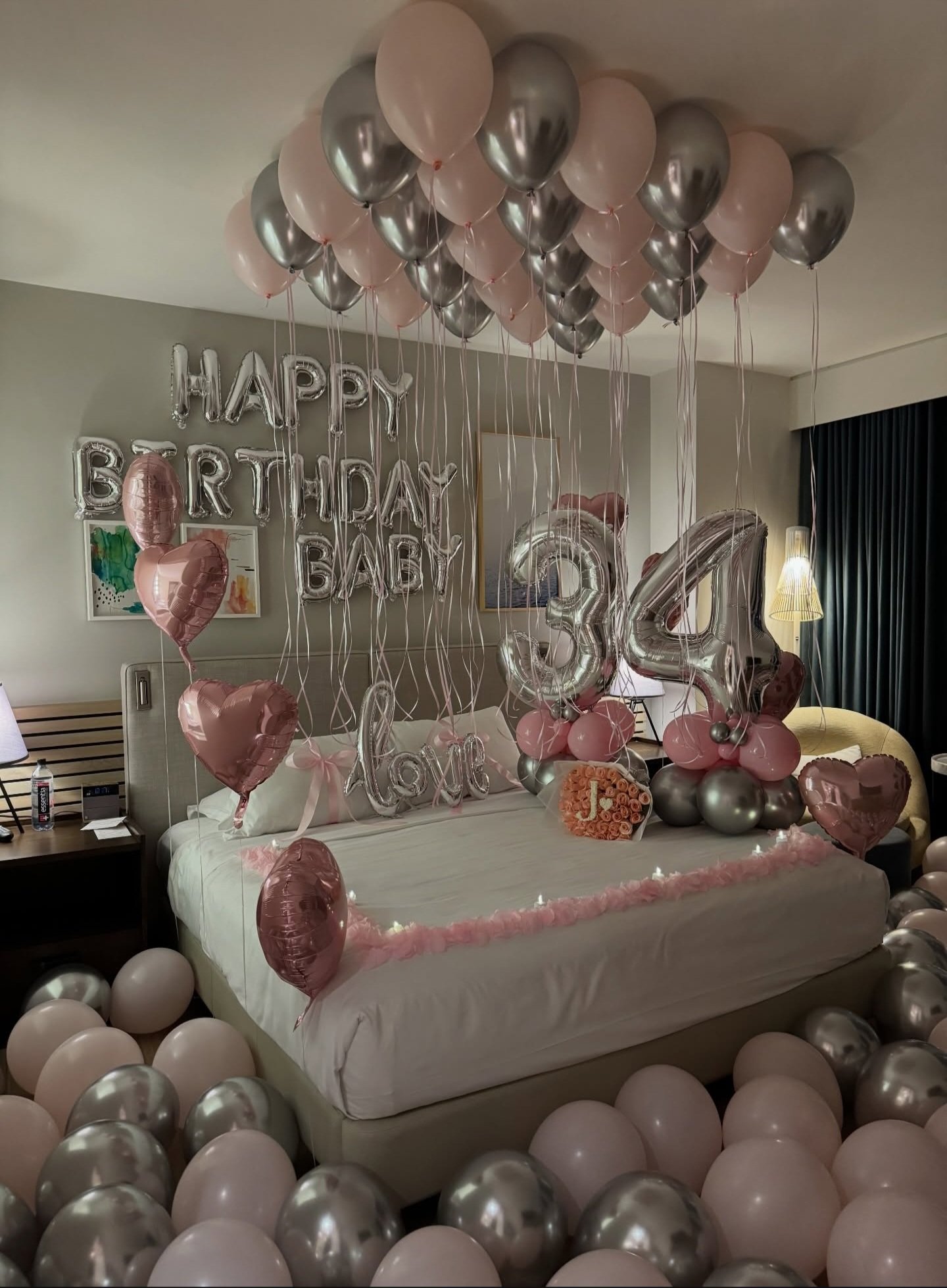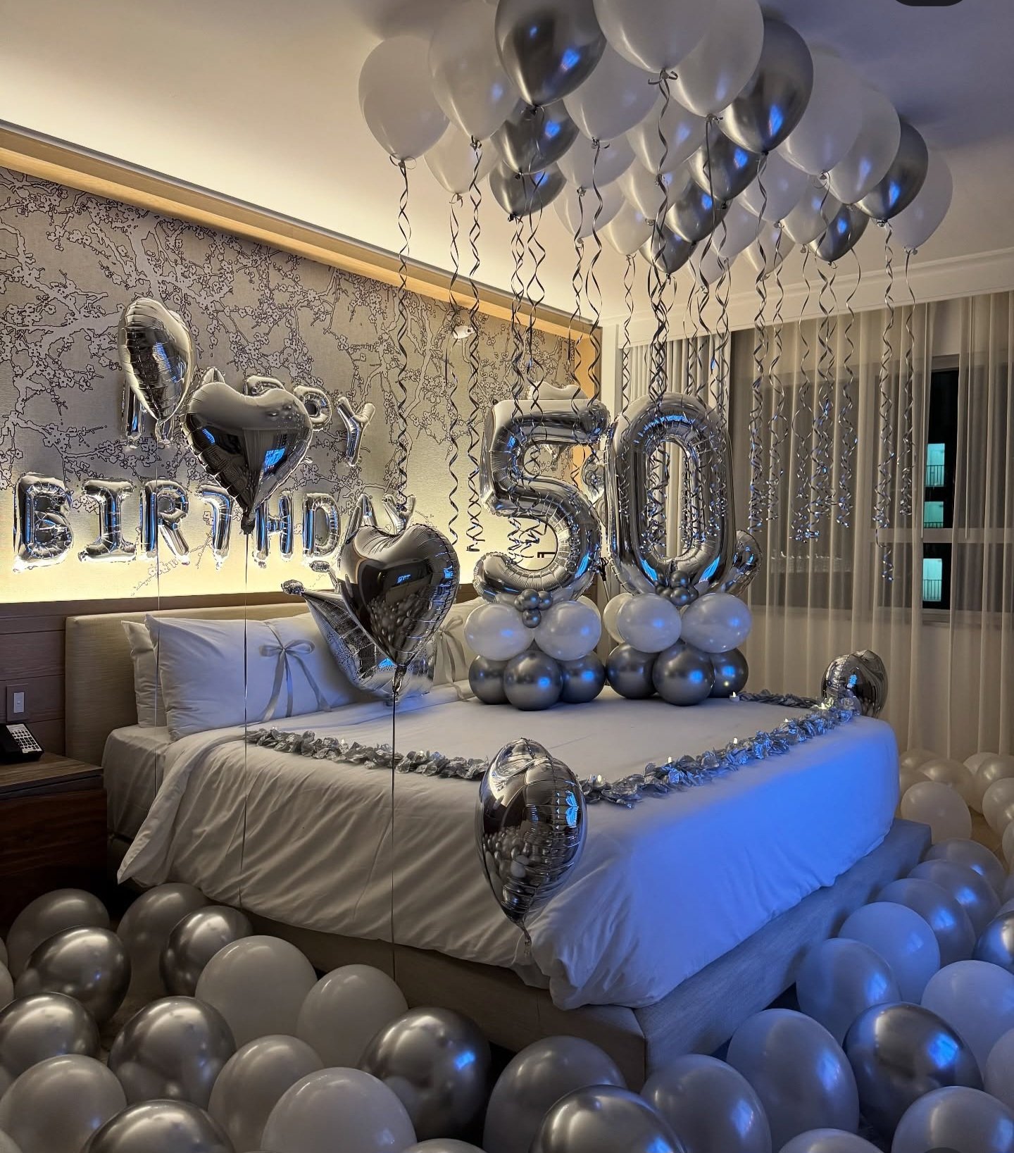 An elegant and timeless setup featuring a custom balloon organic garland and a personalized banner. Perfect for making any age feel like a milestone.